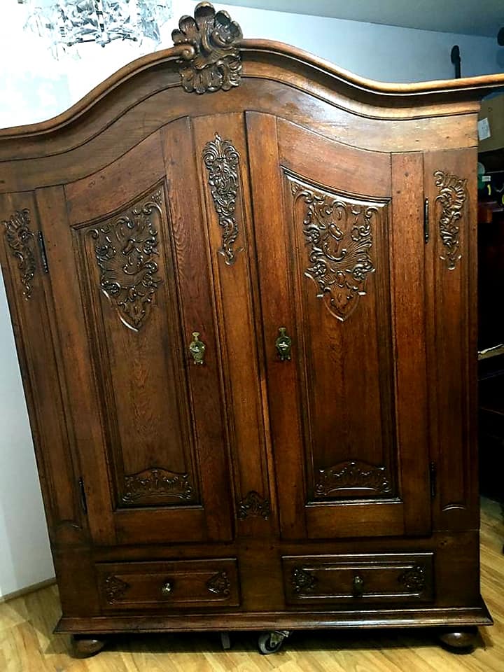 Szafa barokowa 1750 rok. Szafa barokowa po renowacji, jej produkcję datuje się na 1750 rok. Wysokość 210 cm, szerokość 165 cm, głębokość 55-63cm.